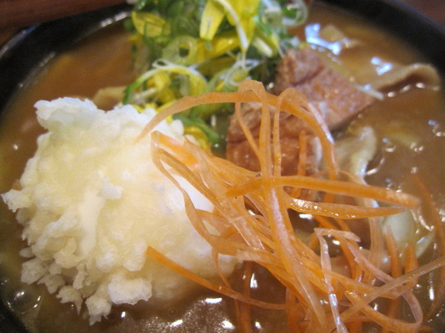 ここのおいしい出汁のかけうどんに、”豚肉のあんかけ”にカレーで風味をつけて、それをかけ、半熟玉子揚げ、あぶらあげ、千切りにんじん、かいわれが乗っています。