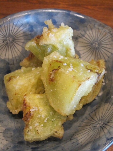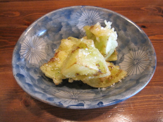 茄子っぽい味がする不思議な味。味付けは塩のみ。中央の軟らかい部分は水分が多く、あわてて食べると熱湯汁が噴出すので注意。