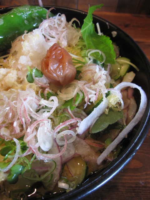 しょうがの繊切り、タマネギのスライス、シソ、がトッピング。昨年から穂紫蘇(ほじそ)が・・・!?