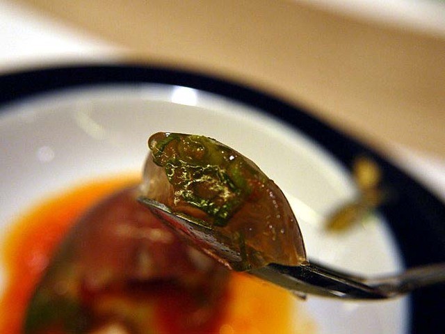 さっと火を通した和牛のもも肉と松茸を牛だしとブイヨンで作った煮こごりの中に閉じこめています。