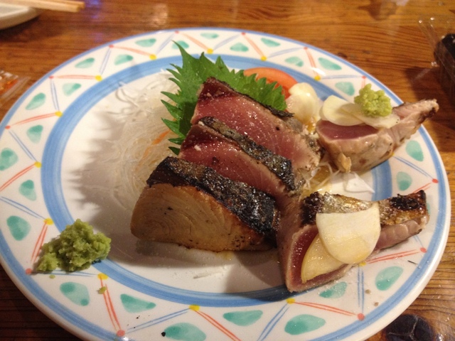 この相性がバツグンにうまいのです。このカツオのタタキは、藁焼きだでしょう。美味さが