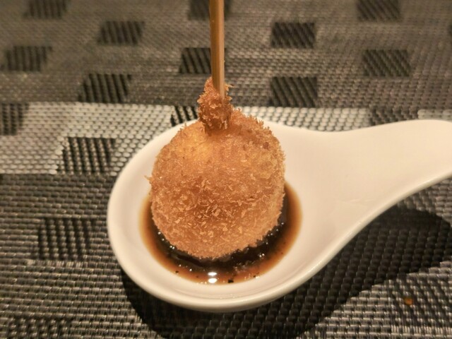 アルコールをスパークリングに変え、捻りの効いた串が続々と到着。