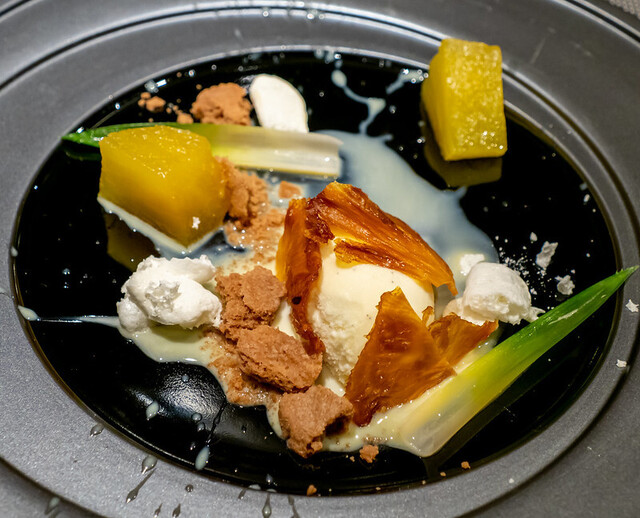ホタテと真鯛のマリネに大葉とバターミルクのソースが添えられます。マリネの旨味と蕪の食感、柑橘の酸味が楽しいです。
