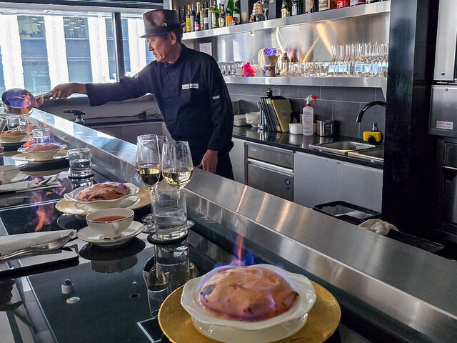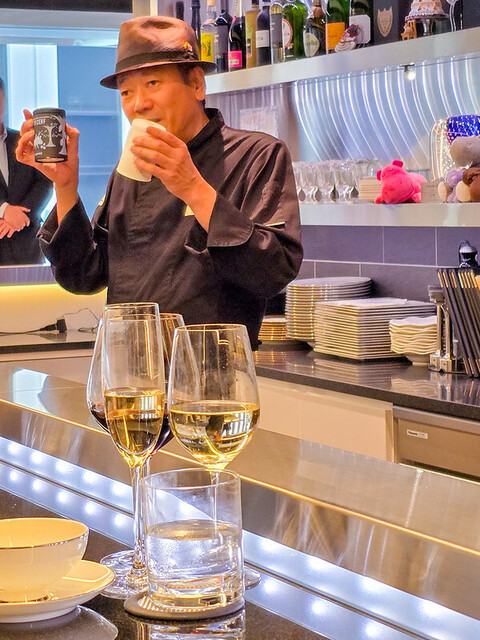 料理・スイーツを作られる姿を観ながら、シャンパンやワインとのマリアージュを楽しめます。