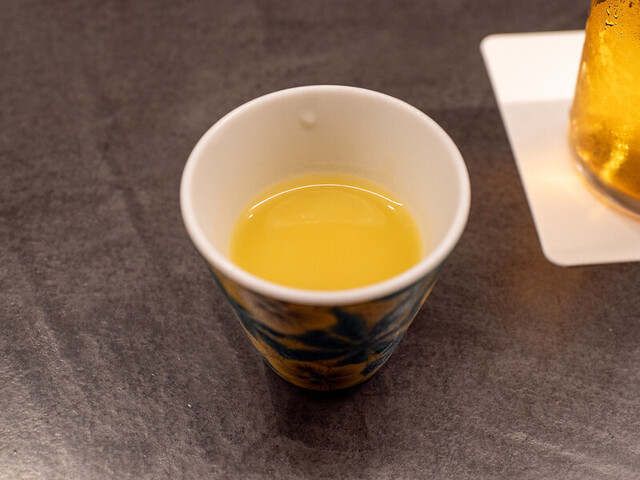キャベツとちくわの唐辛子味噌和え、フグの煮凝り、鶏むね肉の南蛮漬け、炙りカジキマグロの棒寿司、マスカルポーネチーズと甘納豆のカナッペの5種の前菜盛り合わせでした。唐辛子味噌のアクセントやマスカルポーネチーズと甘納豆の甘みなどそれぞれ異なる味わいや食感を楽しめ、食欲がさらに刺激されますね。