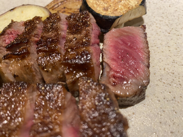 お肉を丁寧に焼いて下さるのを見ながら、赤ワインのグラスをオーダー。赤もリーズナブルで美味しいワインでした。肉の焼き加減は、ワシはミディアムレア、美しいだけの嫁はレアで頂きました。味付けは、山葵、岩塩、出汁醤油です。