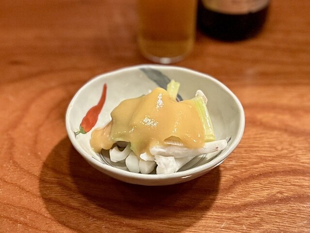 今回もやはりビーフシチューは売り切れていた。だが心配は無用だ。というのも、ここのポークソテーが絶品だからだ。まずは小瓶で喉を潤し、お通しのてっぱいをいただいた。からし酢味噌の味わいが絶妙で、クオリティの高い一品だ。