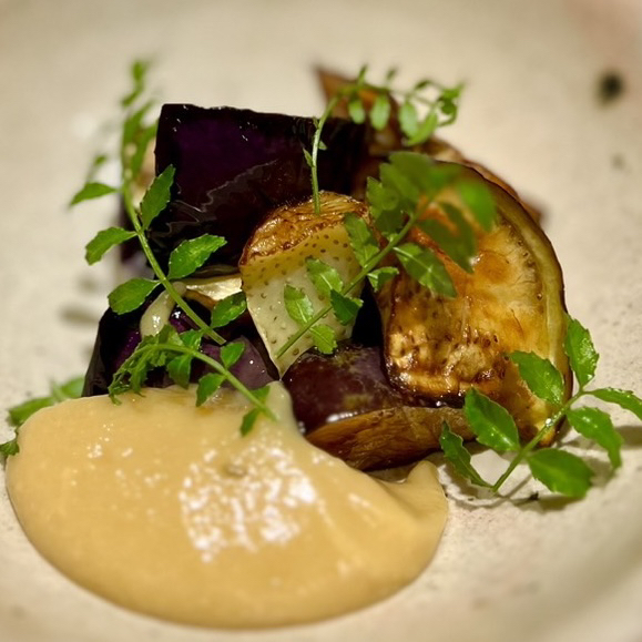 この日は魚料理が豊富だった印象。フリットやフライなど目移りしたが、最終的に選んだこのカンパチは絶品だった。新鮮な肉厚のカンパチは、本わさびの風味と相まって、口の中で溶けるような美味しさ。下に敷かれた大根おろしや、すだちの爽やかさが加わることで、さらに味わい深くなった。まさに割烹で出会うような品質の魚料理だ。