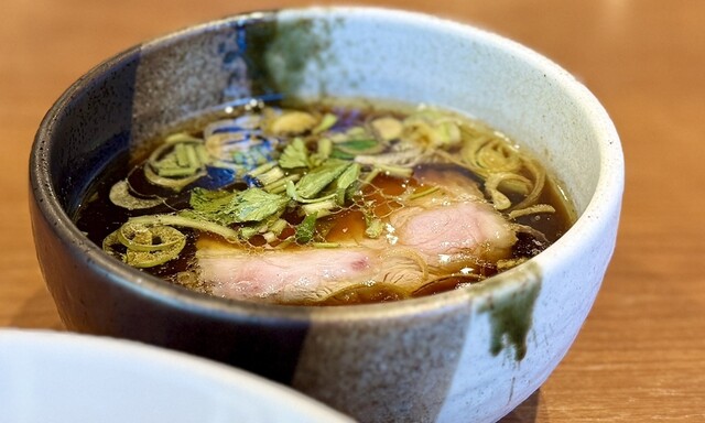 自家製の細麺は、しなやかなコシとつるりとしたのど越しが印象的。鶏チャーシューはしっとりとした火入れ。豚チャーシューは、軽くスモーキーな香りもあり、ラーメンの合間にそのままつまんでも満足度が高い一品。