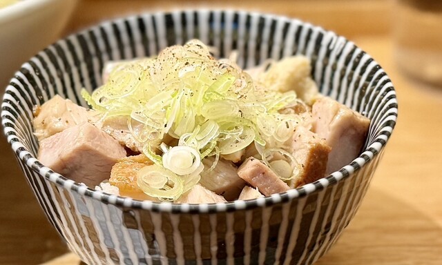 「肉ご飯」は、角切りチャーシューと刻み葱をあしらった小丼。見た目は素朴ながら、肉の旨味が凝縮されており、「中華そば」との組み合わせによって食事としての完成度が高まる。