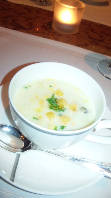 料理長特製スープは蝦夷アワビ・ウニ等を贅沢に使用しています。アワビはとても柔らかく食感がいい。表層・中層・底の層でスープの味が変化する手の込んだ素敵なスープでした♪バケット等はバターやオリーブオイルをお好みで頂きました。