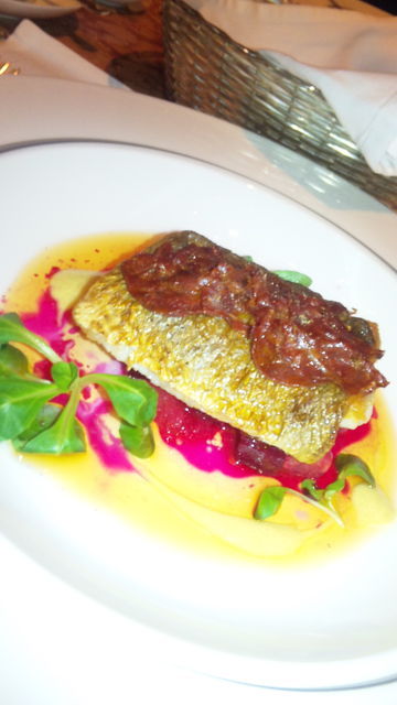 次に四国産のニベ(イシモチ)は料理長の手に掛かると色彩豊かな一品に変身♪香ばしさが漂い、イベリコの燻製もトッピングされています。 癖のない白身をそのまま食べたり、イベリコと一緒に食べたり、甘酸っぱいソースに絡めて食べたりと満喫できます♪