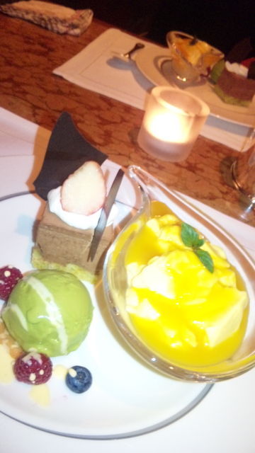 お待ちかねのデザートは「抹茶アイス」と「ショコラケーキイチゴと板チョコ添え」と「マンゴープリン」。コーヒーと一緒に堪能。抹茶アイス・ケーキ・マンゴプリンの順に食べましたが、正解は「マンゴープリン」からがベストだと思います(*^_^*)サワークリームで爽快感も出しているそうで、マンゴーソースとプリンのとろとろ感も大満足♪私的にはミントに着目!ミントの爽やかな香りだけでなく、ミントを一緒に食べて判る味の広がりが最高でした!