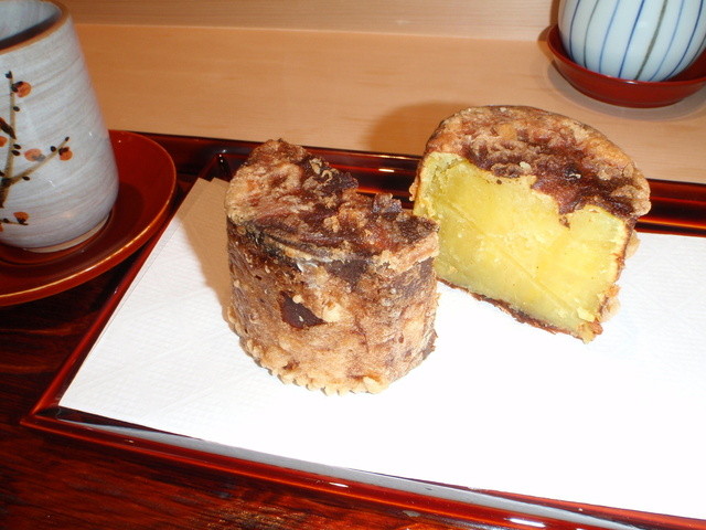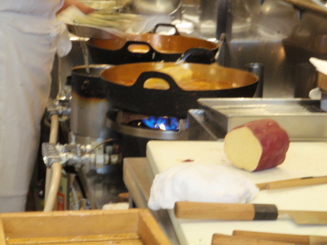 やっぱり目玉はさつまいもの天ぷらで20分かけて揚げますが、わざと焦がして焼き芋風に仕上げています。ホクホク感がいいですね(#^.^#)