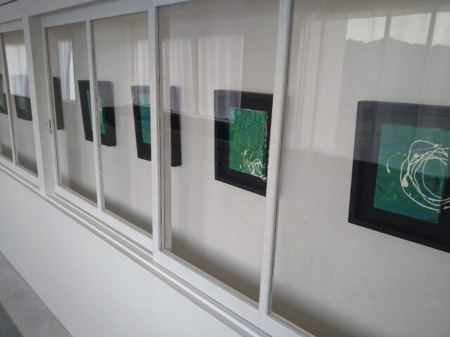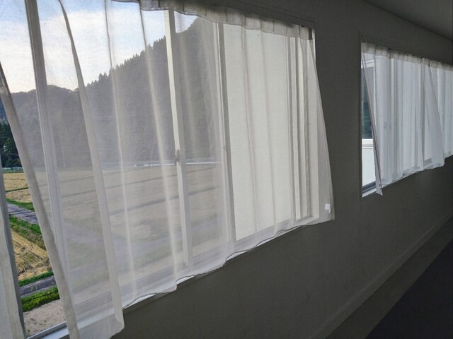 廊下にそそぐ優しい風が白いカーテンに揺れて
