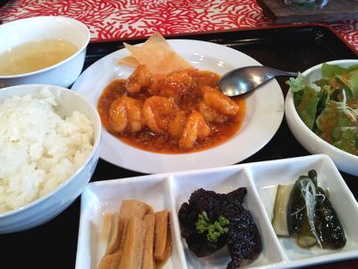 芝エビのチリソース煮セット(1100円) 前菜3種・サラダ・スープ・ごはん・デザート付