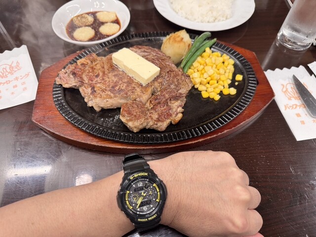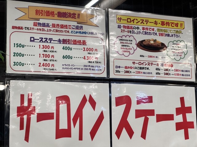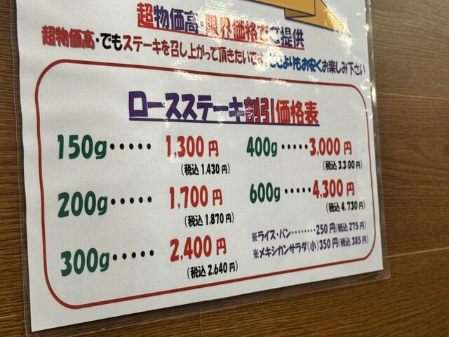 (ロースステーキ400g3000円+ライス250円+ベビサラダ(小)350)+消費税=3960円