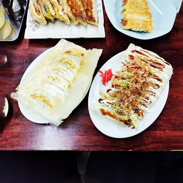 お好み焼きも餃子の皮も小麦粉を焼いたものですから、ソース・マヨネーズ・鰹節は相性良く美味しかったです。