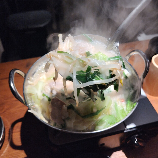 プリプリ食感ももつに、野菜と鶏白湯の旨味と明太子の辛味が染みて美味でした。