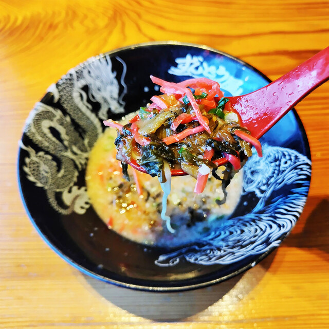 麺と具材を食べきったら、辛子高菜と紅ショウガを入れて味変し、スープを最後までいただきました。