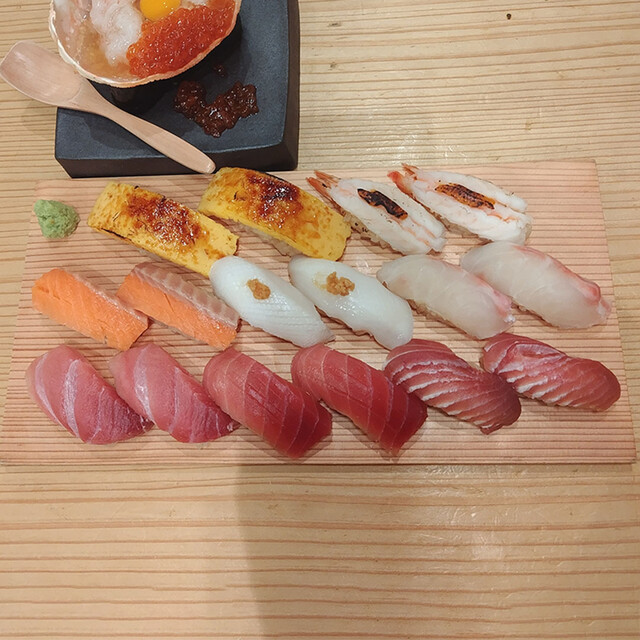 ネタは大トロ・トロ・鮪赤身・鯛・イカ・サーモン・海老の炙り・玉子です。