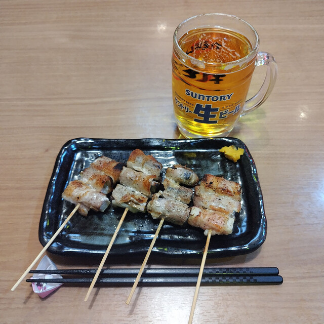 人気の高い焼き鳥の5種類(つくね・鳥皮・ササミ・ねぎま・もも)を甘辛いタレでいただきました。