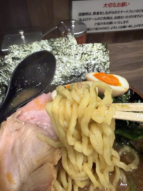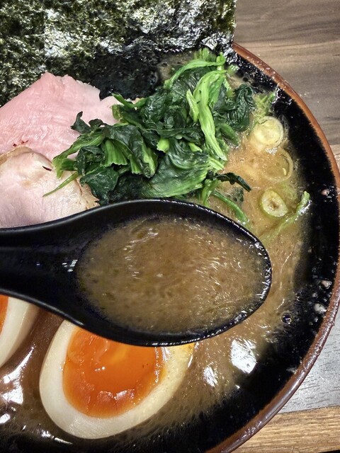 豚骨醤油ベースの家系スープは、濃厚でコクがありながらキレもある絶妙なバランス。一口飲んだ瞬間から、その完成度の高さに驚きました。クリーミーな口当たりで、最後まで飽きずに楽しめます。