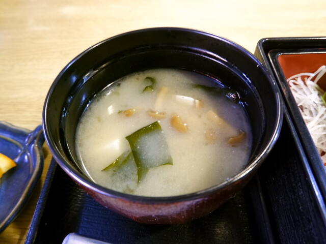 お弁当箱の中は刺身コーナー、天ぷらコーナー、巻物コーナー、煮物コーナーに分かれています。ご飯はそこそこ良い盛り具合。味噌汁は、ワカメとナメコが入っていました。刺身はマグロ、ブリ、鯛のようです。天ぷらは大海老、ピーマン、茄子、アスパラを何かで巻いた物。天ぷらはそれぞれ天つゆに付けて頂きました。
