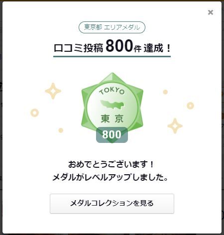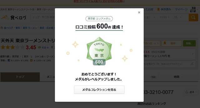 東京エリアメダル 口コミ600店達成 (2022/02/11)