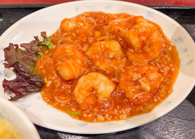 主菜(メインのおかず)のえびチリ,主食のメシ,そして副菜のサラダ,スープ,香の物のどれをとってもしっかりしたものでうまい。えびチリのエビはけっこう大型だし味付けも唐辛子の辛みと玉葱・ネギのみじん切りの甘みが厚みを持たせていてすごく良い。