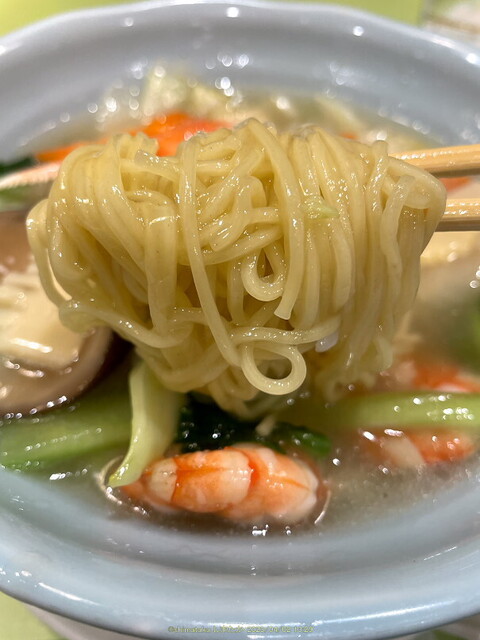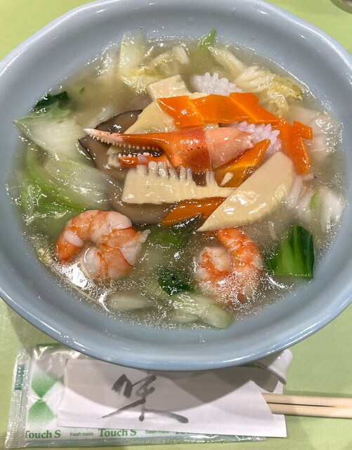 湯はうす塩でほどよく鶏油が溶け合った優しい味だが,海鮮のカニのツメと海老の塩味がたった感じ。