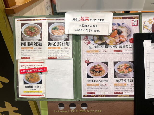 頭は海老雲吞麺だったのに,なぜか自分は【海鮮五目麺】1,850円(込),家内は【塩・海鮮五目あんかけ焼きそば】1,850円(込)を注文。