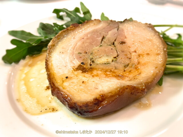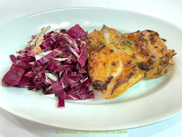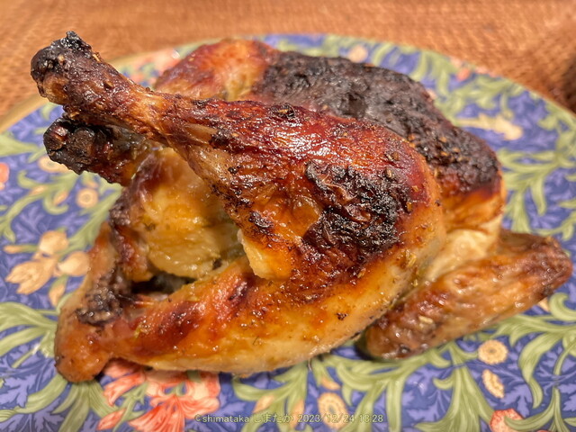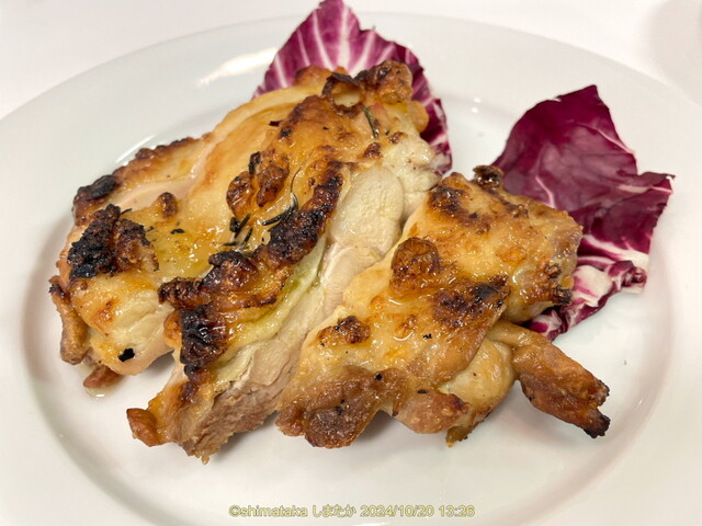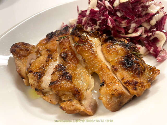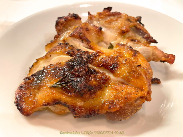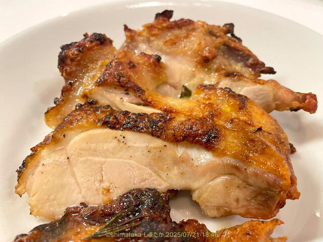 【ローストチキン】塩味控えめ(これはおそらくしま家用スペシャリテ)でローズマリーの燻製風味がなんとも香ばしい。