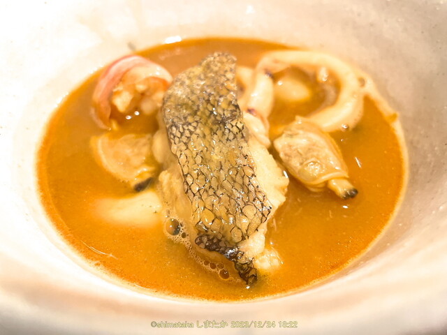 【ブイヤベース】前週までの打ち合わせ時,寒いから「汁ものが欲しい」とリクエストしたら作ってくれた。スズキとムール貝ほか魚介類から出たダシ濃厚。