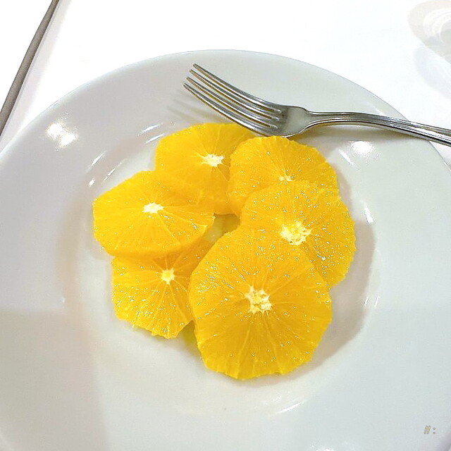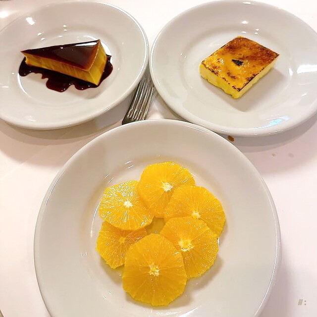 仕上げのデザートは,各々プリン,冷凍プリン,フルーツ(オレンジ)。