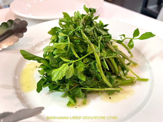 料理は基本おまかせで,クレソンサラダ,ブロッコリーサラダ,フォカッチャ,きのこソテー,海鮮ものフリッター,ローストチキン,トマトソーススパゲティなどを出していただきました。