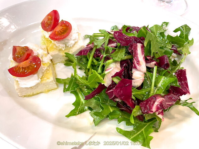 自分【鶏もも肉のロースト】に【葉野菜サラダ】,家人【ポルペッタ】に【きのこのラザニア(+トリュフ香味付)】を思い思いに頼む。