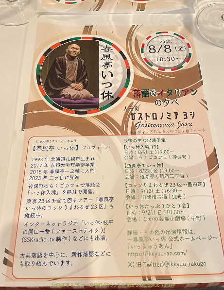 春風亭の2つ目落語家の小噺を肴においしいヨシさんのイタ飯をいただくという企画ディナースペシャル。