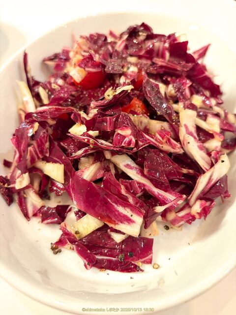 頼んだのは,【葉野菜(赤キャベツ+ブロッコリー+ロマネスコ)のサラダ】【アラビアータ・スパゲティ(激辛)】