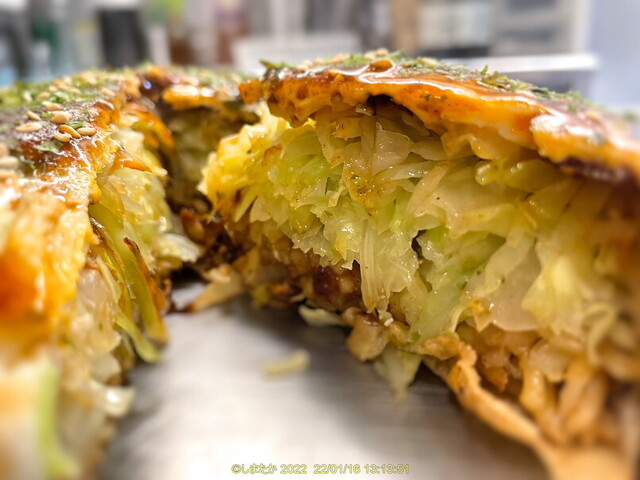 18cmほどの生地(やや硬め)に 手切りキャベツと細身のもやし厚盛り。イカ天のカリっと香ばしい味に玉子Wのふっくら加減。仕上げに甘めのオタフクソースに白ごま。