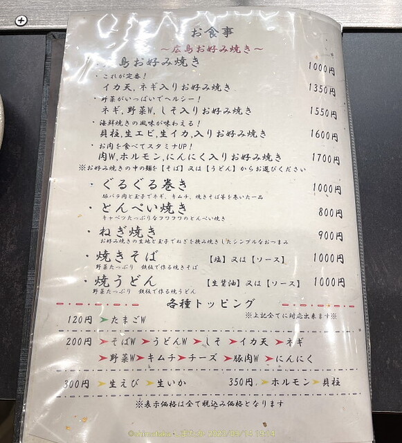 お食事(広島お好み焼き)【ネギ,野菜W,しそ入りお好み焼き】がおススメ。