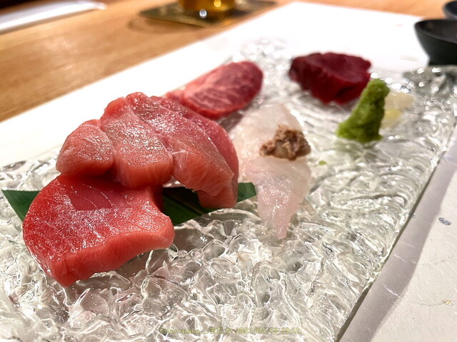 《お造り》自分は本鮪,友人は馬刺しをチョイスしたところ,2人分とも両方の素材を盛ってくれました(ありがとうございました)