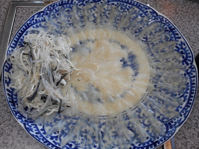 先付けはフグの煮こごりとフグの身を練り込んだ蒲鉾麺、そして本日のメインイベントは、フグ刺しの食べ比べです。一皿は一般的な菊盛りの皿、そしてもう一皿は二枚引きの皿です。二枚引きとは、薄く引いたフグ刺しにさらに包丁を入れる高度な技法です。二枚引きのフグ刺しのみで盛られた皿はワタシも初めての体験ですが、そのテクスチャは未体験の領域、まさに至福の食感です。
