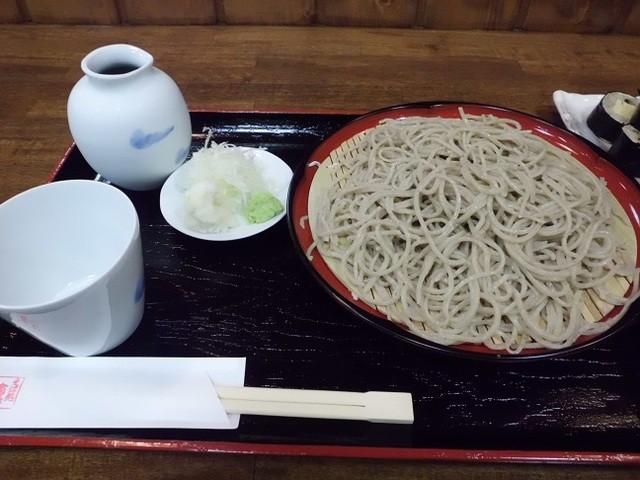 今日は、「もりそばセット1,000円」を注文しました。セットの内容は、もりそばと蕎麦寿司のセットで、もりそばは、挽きぐるみか殻をむいた蕎麦のいづれかを選択できます。今回は殻をむいた蕎麦を選択しましたが、石臼で挽いた自家製手打ち蕎麦は香りも良く、とても美味しい蕎麦を堪能できました。