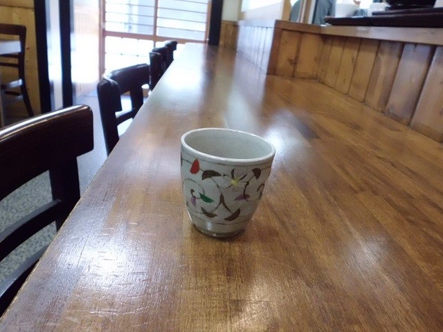 店内カウンター席。お茶はもちろん蕎麦茶です。