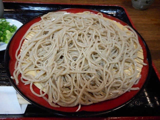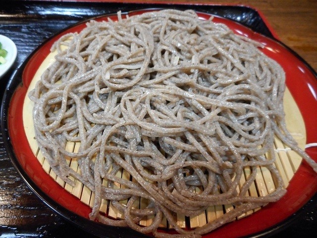 薬味は、白ネギとワサビと辛味大根がたっぷりと添えられています。このあたりで薬味に辛味大根が添えられているのは珍しかったので、店主さんにお尋ねしたところ、自家栽培で育てているとのことでした。ご主人は、このあたりの気候は辛味大根の栽培に適していないのでうまく育たないとごぼしておられましたが、手打ち蕎麦にとても良く合う貴重な薬味です。