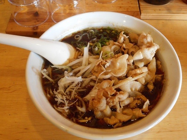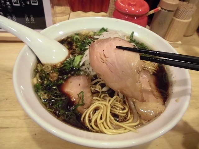 しばらくして出されたラーメンは、醤油ベースの黒いスープで、富山ブラックのようなルックスですが、調理人の方(店主さん?)にお尋ねしたところ、富山ブラックではなく、金沢で修業したお店のレシピがベースだそうで、魚介類は使用していないとのことでした。