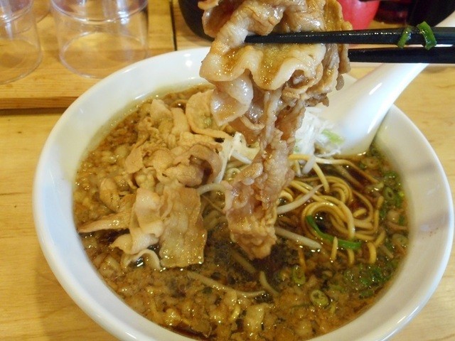 中太麺で注文した「下関ブラック」の上に豚シャブ肉が山盛りにトッピングされています。