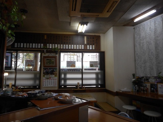 店内は、4人掛けのテーブル席が2卓の他はカウンター席というこじんまりとした造り。カウンターの上部には総菜の皿が並んでいて、大衆食堂の雰囲気満載だ。