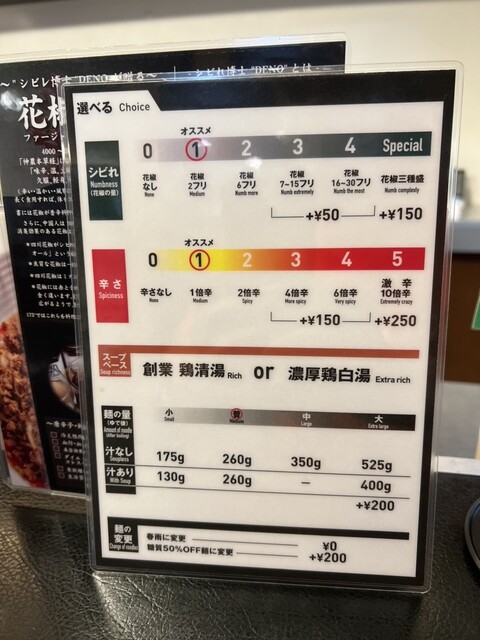 選べるチューニングは、シビれ2辛さ2麺の量350gでオナシャス